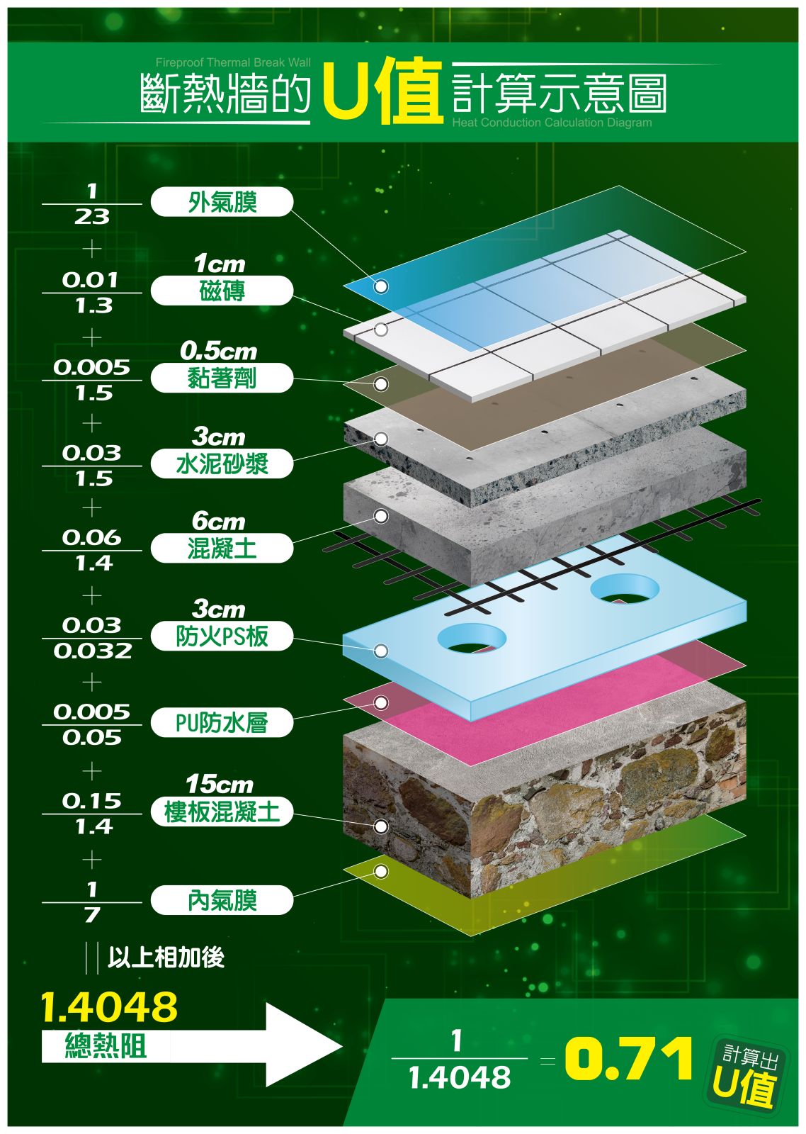 齊步「屋頂隔熱組件」中PS板標準厚度為3cm,其隔熱效果優於綠建材隔熱規範的0.72,中間因開有孔洞而產生許多優良的物理特性,這是傳統PS板隔熱工法無法相較之處,除此之外齊步也可配合綠能設計師不同隔熱強度之標準,提供同樣具有專利孔洞的4cm、5cm或6cm不同厚度PS板,符合業界多元化之需求。